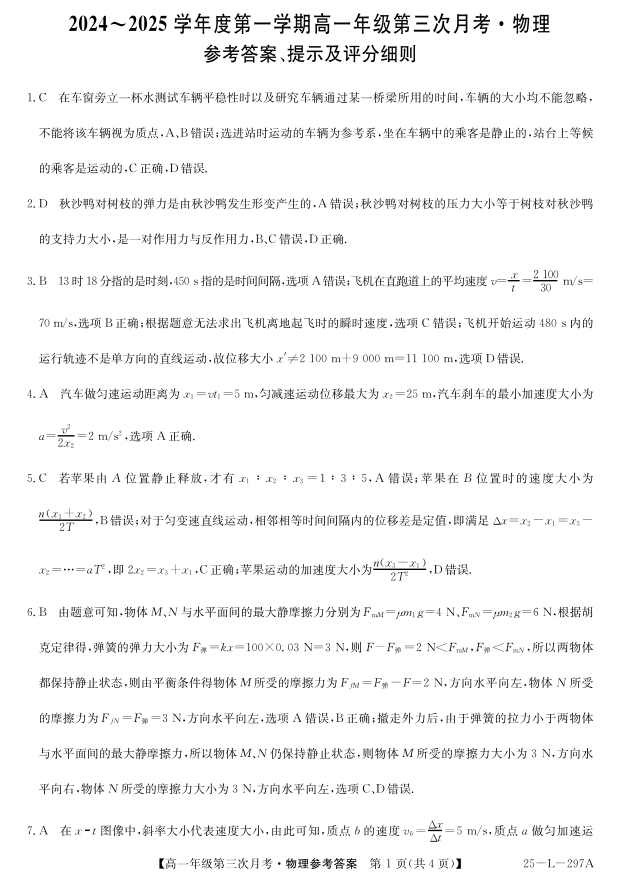 河北省2024-2025学年度第一学期高一年级第三次月考物理答案
