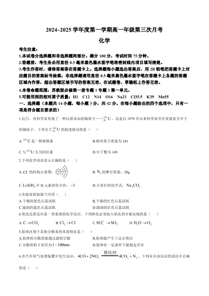 河北省2024-2025学年度第一学期高一年级第三次月考化学+答案