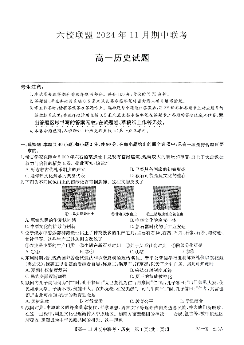 河北省保定市六校联盟2024年11月期中联考历史
