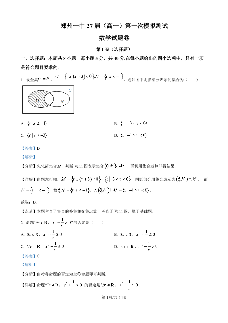 河南省郑州市第一中学27届(高一)第一次模拟测试数学试题(解析版)