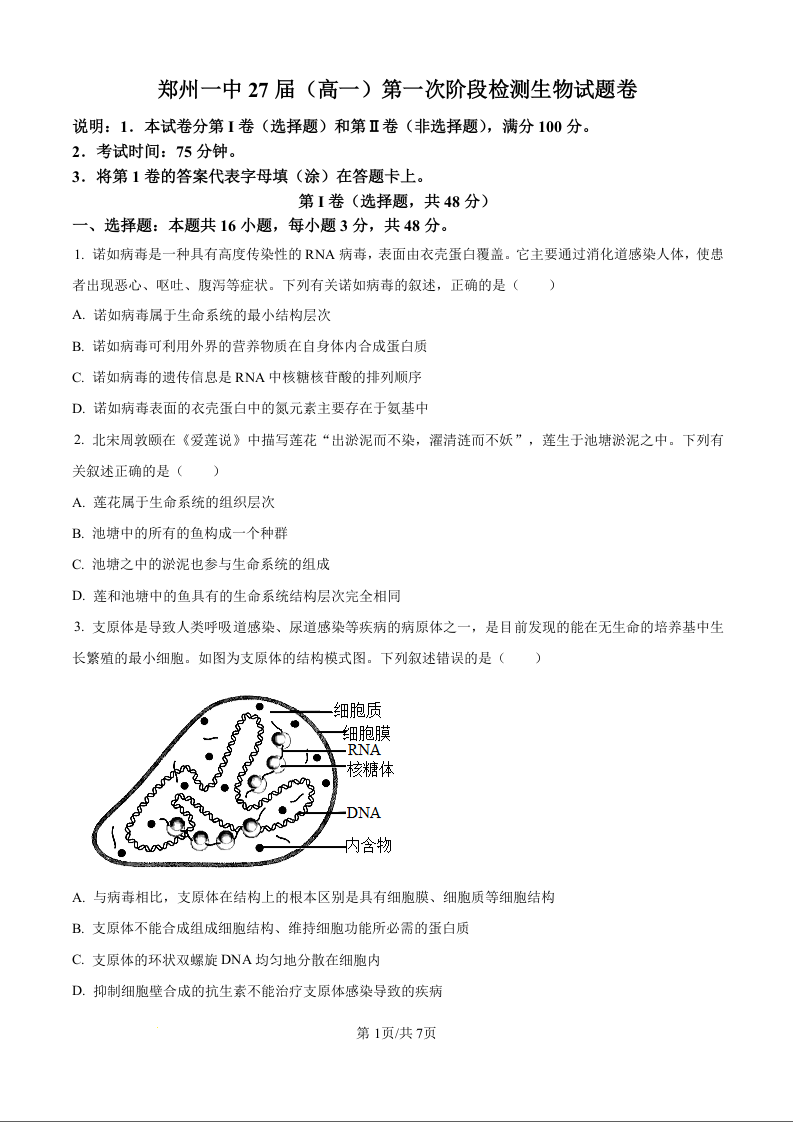 河南省郑州市第一中学27届(高一)第一次模拟测试生物试卷(原卷版)