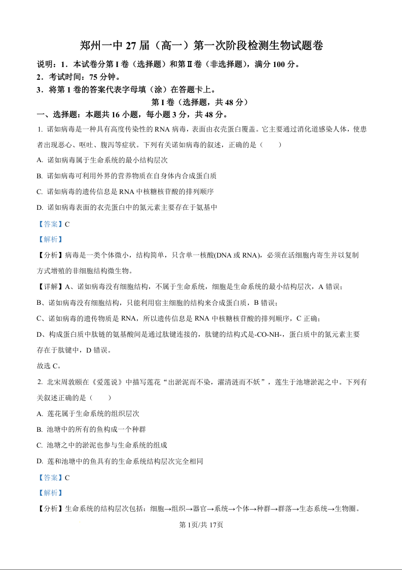 河南省郑州市第一中学27届(高一)第一次模拟测试生物试卷(解析版)