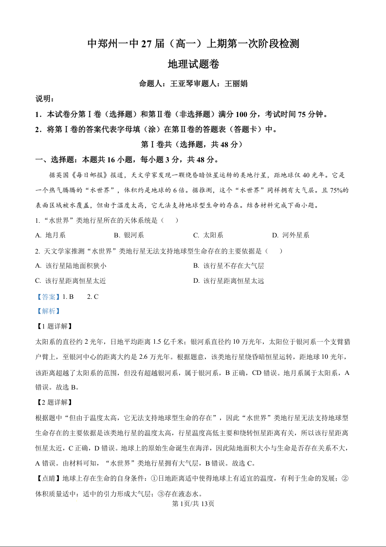 河南省郑州市第一中学27届(高一)第一次模拟测试地理试题(解析版)