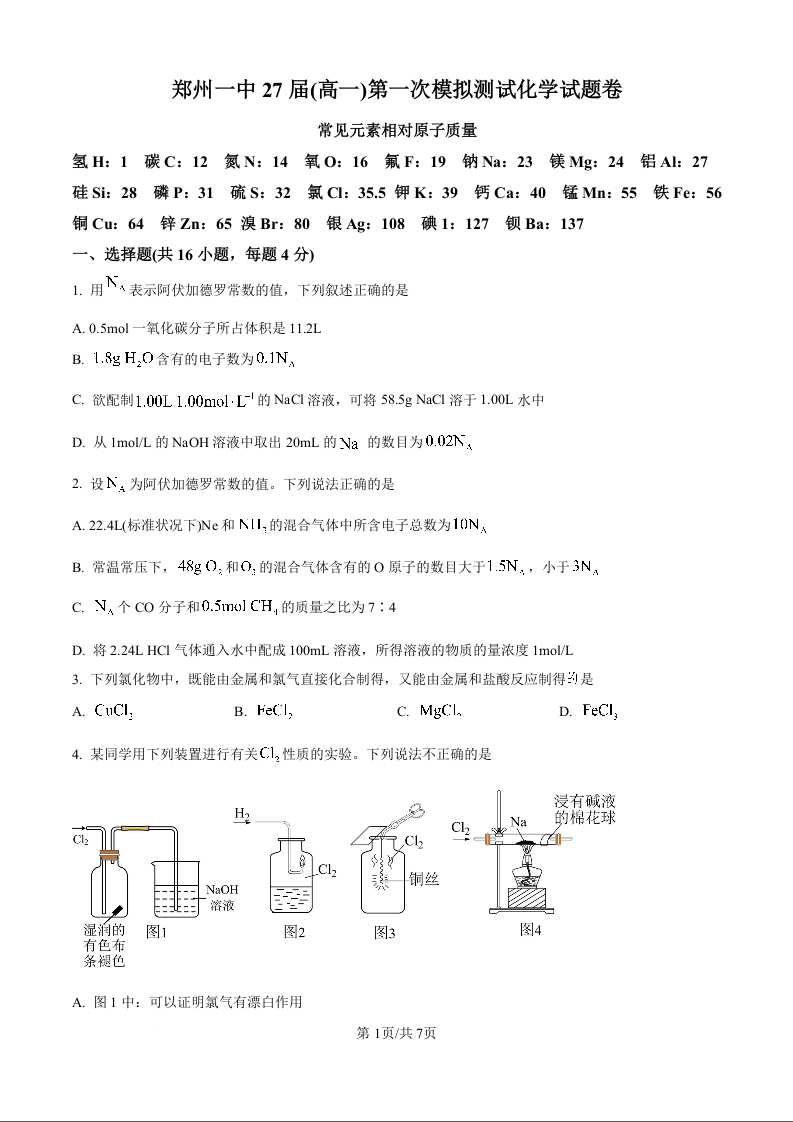 河南省郑州市第一中学27届(高一)第一次模拟测试化学试题(原卷版)