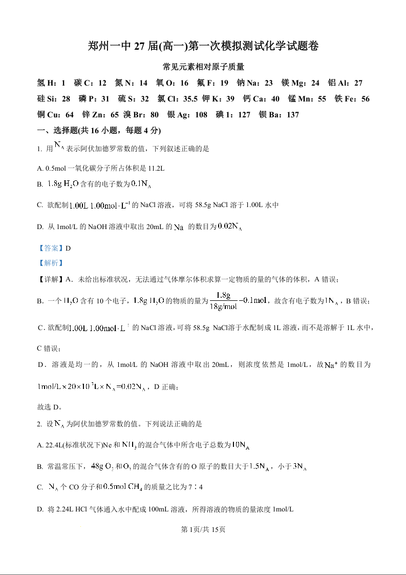 河南省郑州市第一中学27届(高一)第一次模拟测试化学试题(解析版)