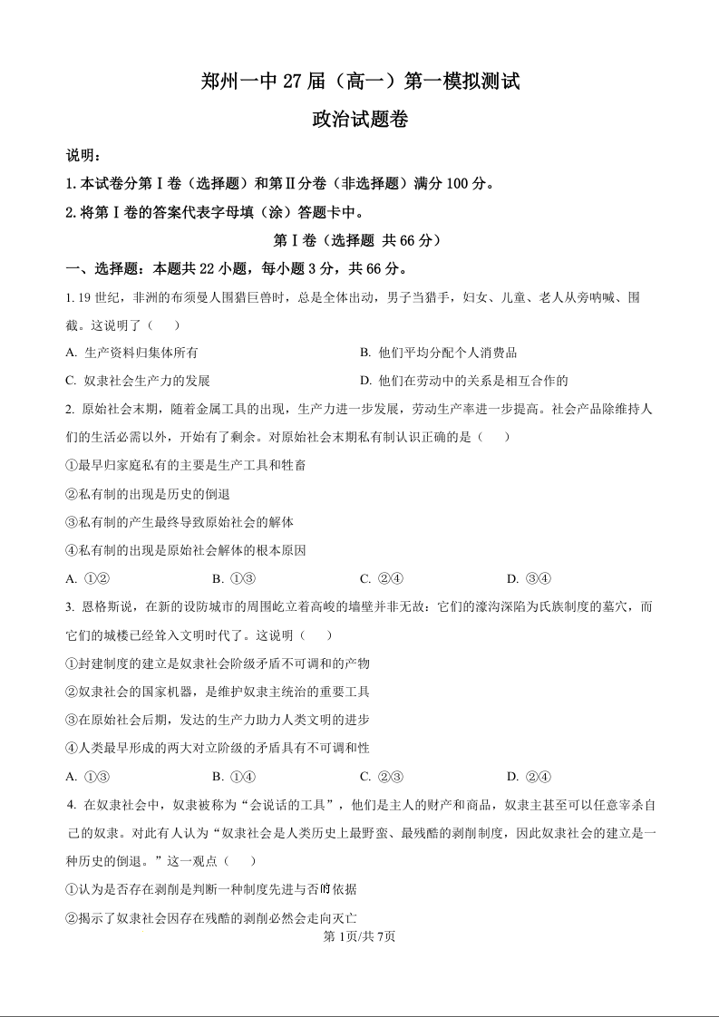 河南省郑州市第一中学27届(高一)第一次模拟测试政治试题(原卷版)