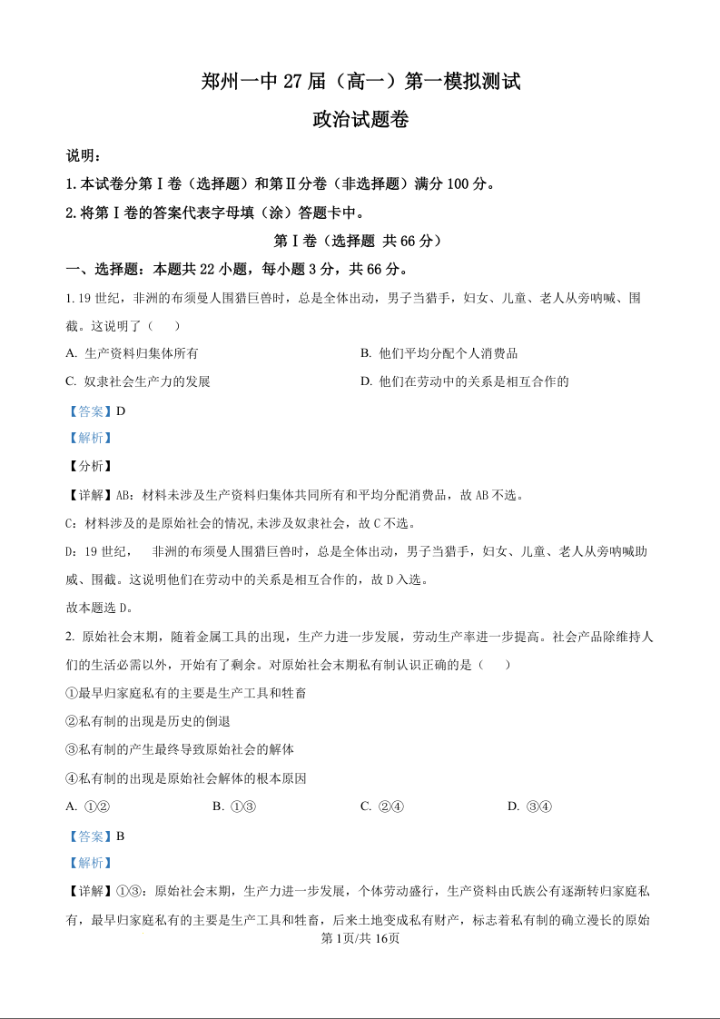 河南省郑州市第一中学27届(高一)第一次模拟测试政治试题(解析版)