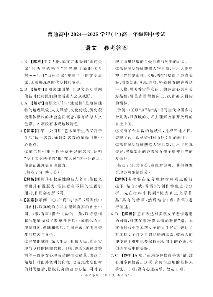 河南省部分学校2024—2025 学年(上)高一年级期中考试语文答案