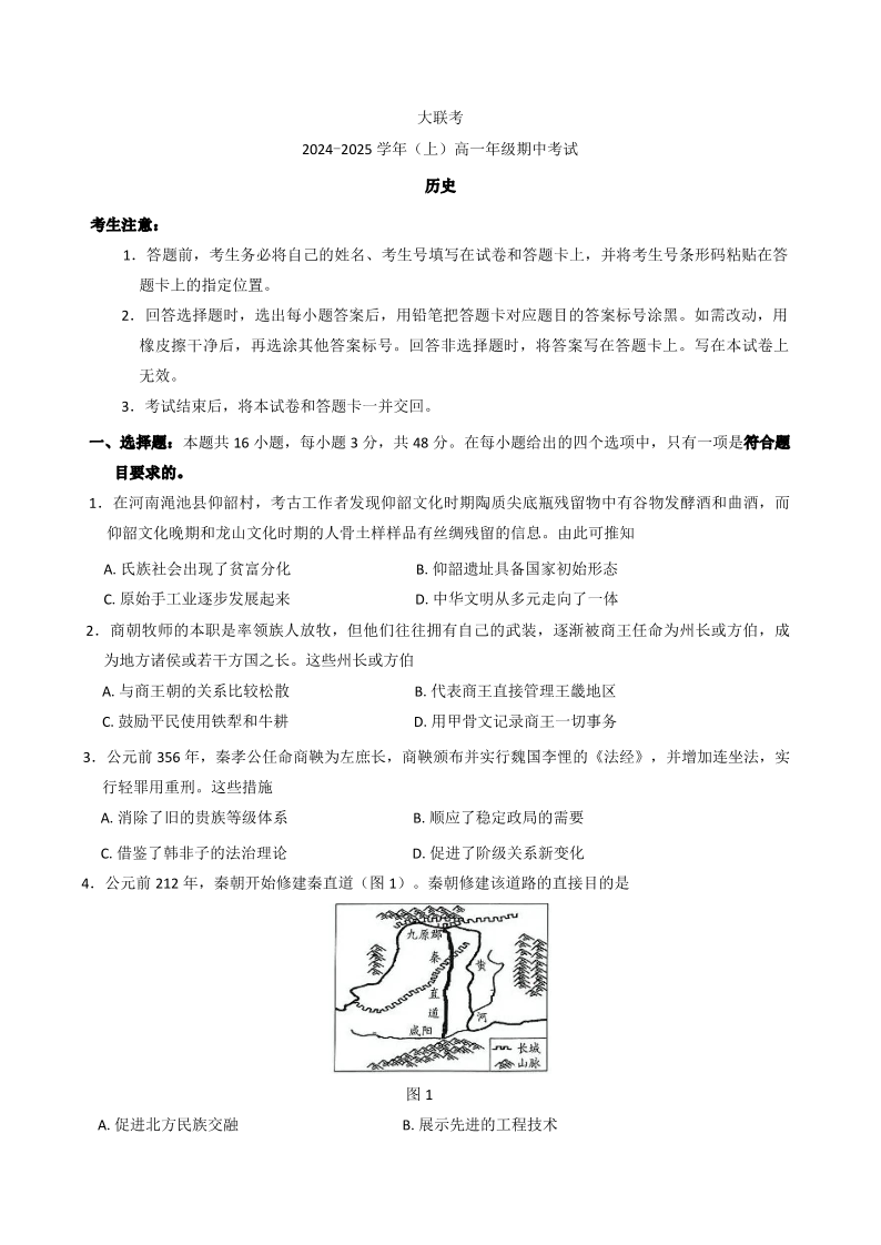 河南省部分学校2024—2025 学年(上)高一年级期中考试历史