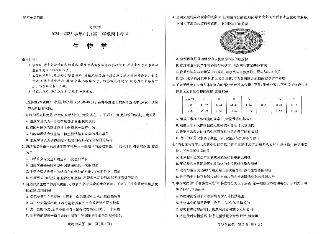 河南省部分学校2024—2025 学年(上)高一年级期中考试生物