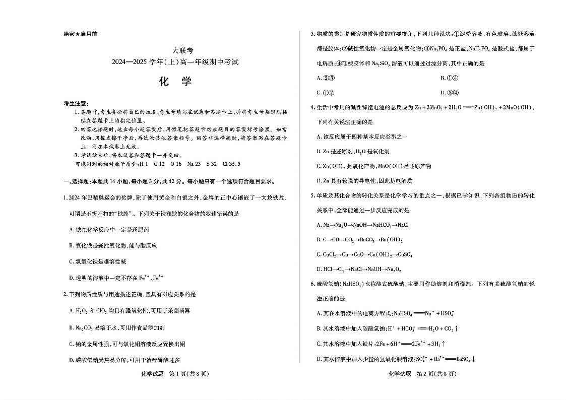河南省部分学校2024—2025 学年(上)高一年级期中考试化学