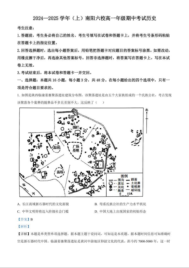 河南省南阳市六校2024-2025学年(上)高一年级期中考试历史答案