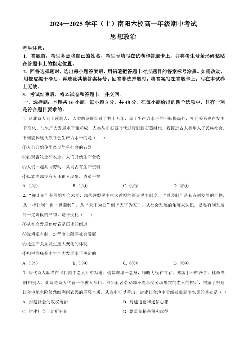 河南省南阳市六校2024-2025学年(上)高一年级期中考试政治