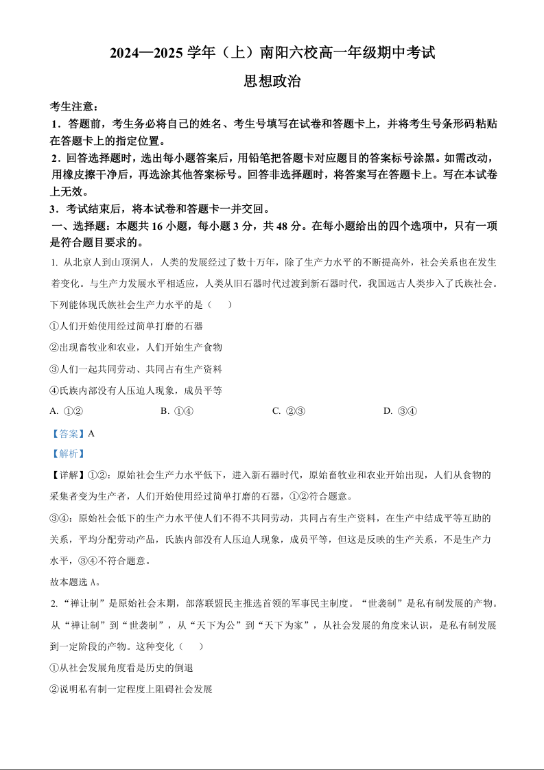 河南省南阳市六校2024-2025学年(上)高一年级期中考试政治答案