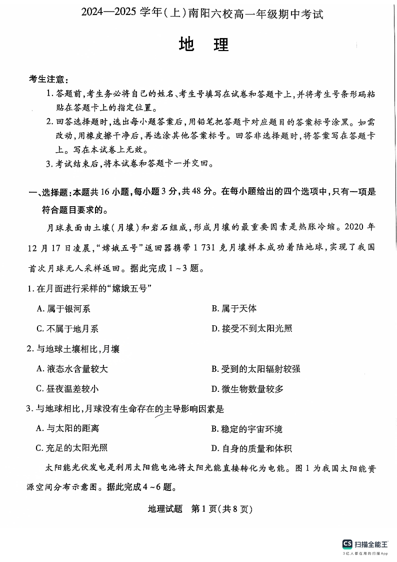 河南省南阳市六校2024-2025学年(上)高一年级期中考试地理