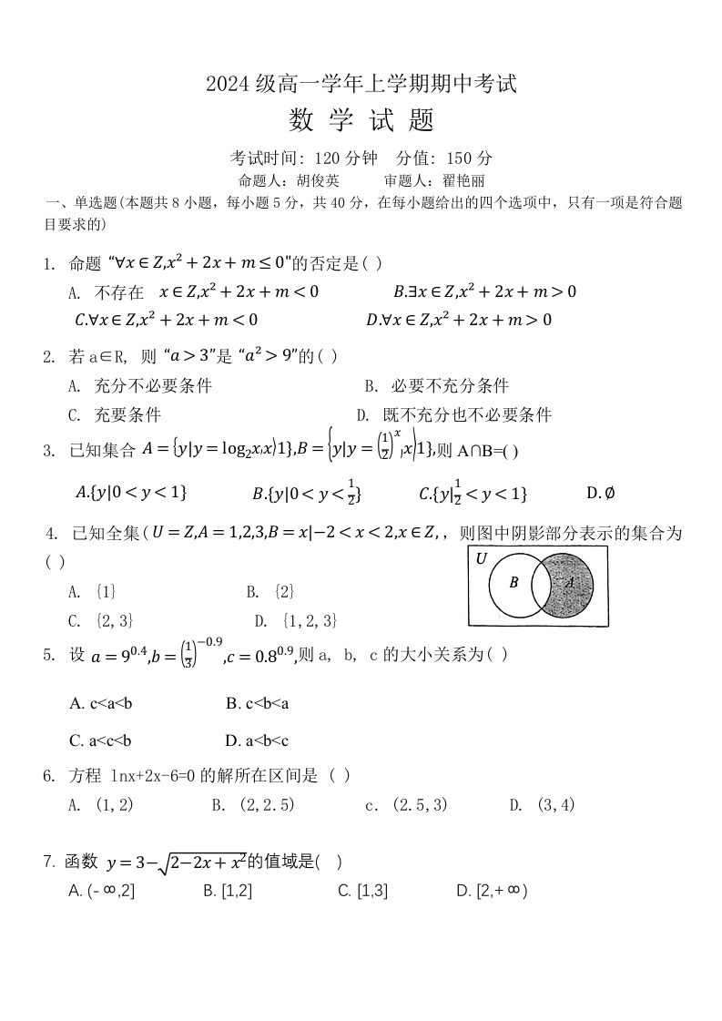 黑龙江省牡丹江市第一高级中学2024级高一学年上学期期中考试数学+答案