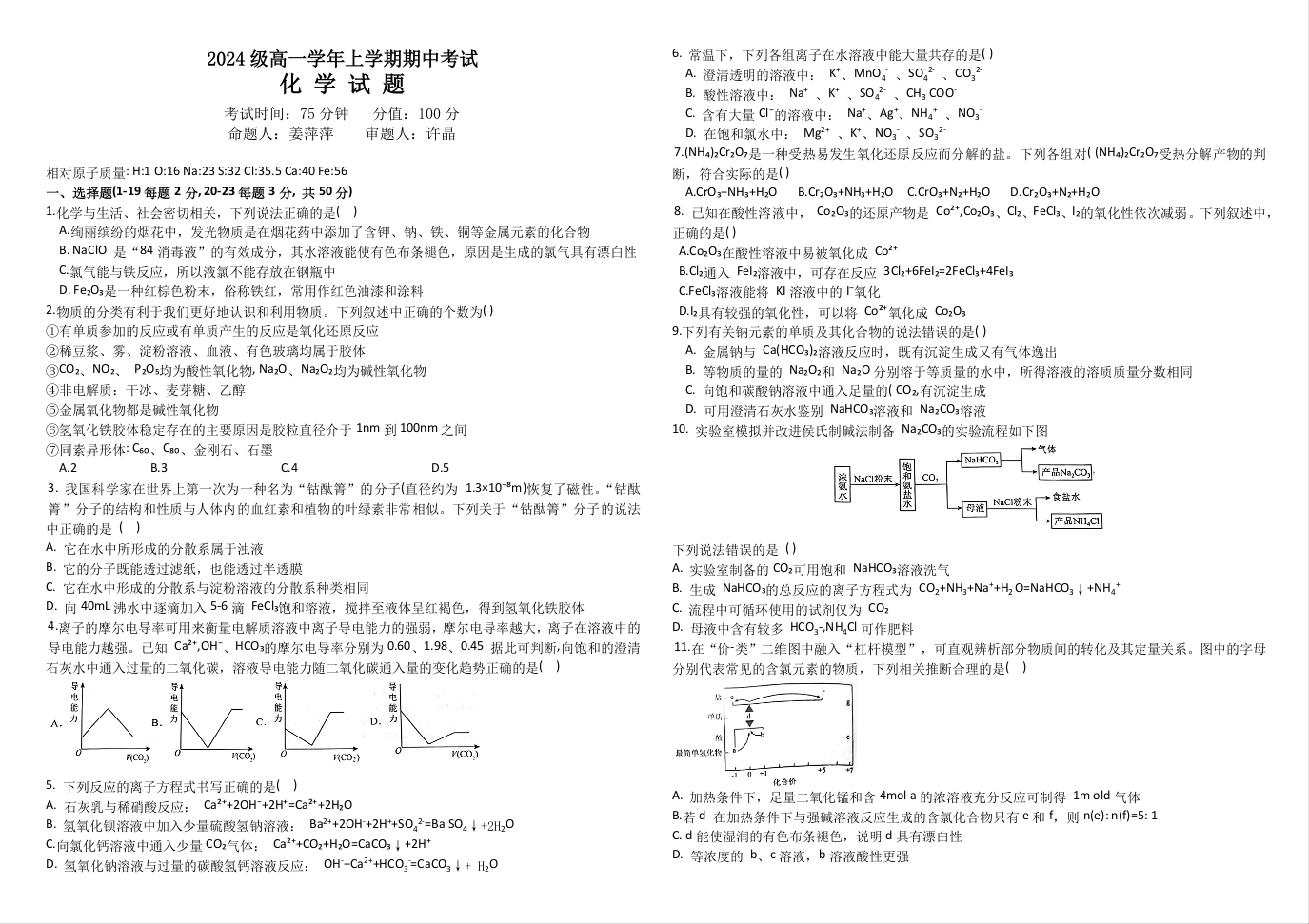 黑龙江省牡丹江市第一高级中学2024级高一学年上学期期中考试化学+答案