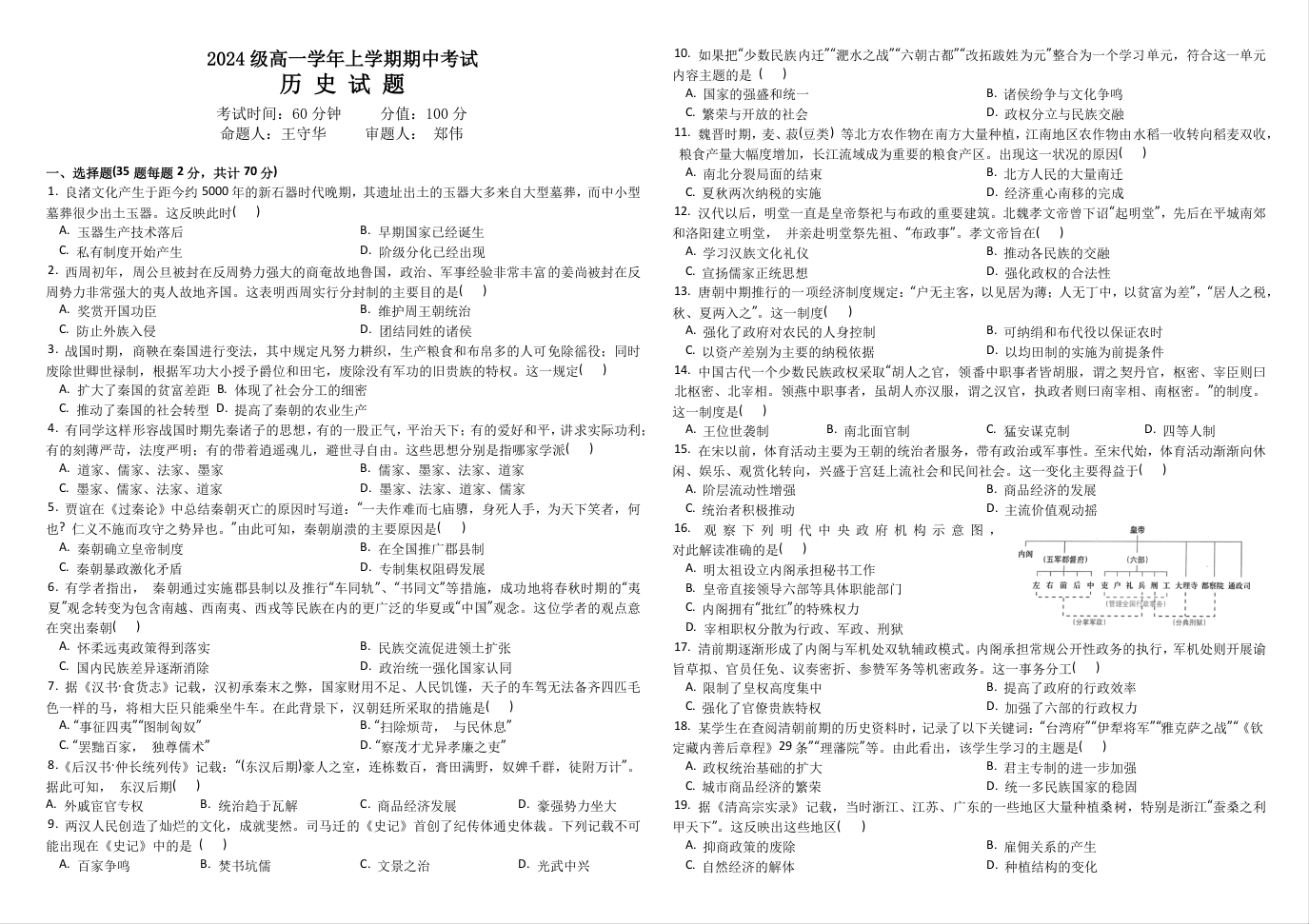 黑龙江省牡丹江市第一高级中学2024级高一学年上学期期中考试历史+答案