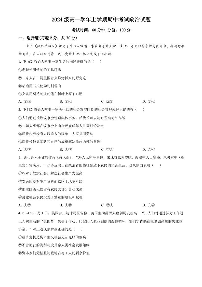 黑龙江省牡丹江市第一高级中学2024级高一学年上学期期中考试政治+答案