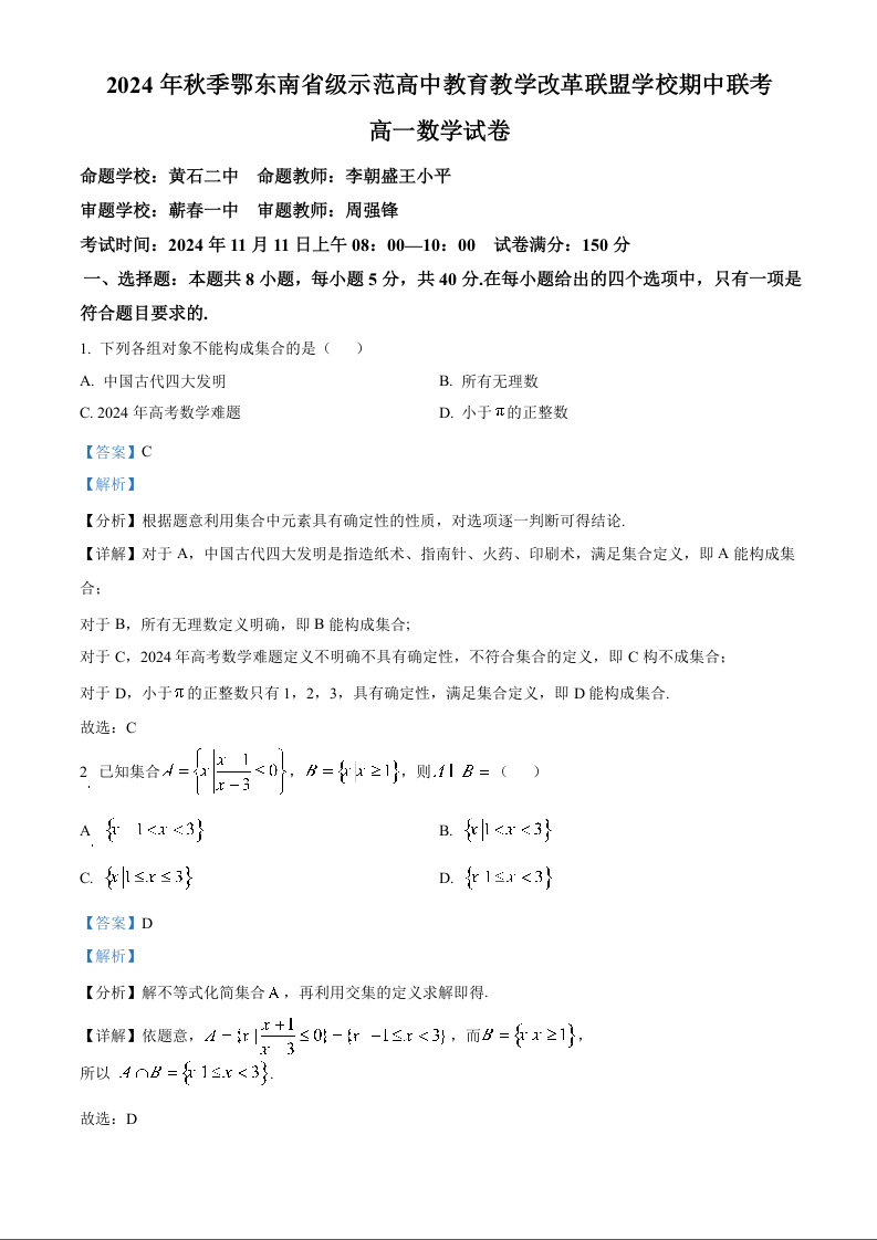 湖北省鄂东南省级示范高中教育教学改革联盟学校2024年秋季期中联考数学+答案