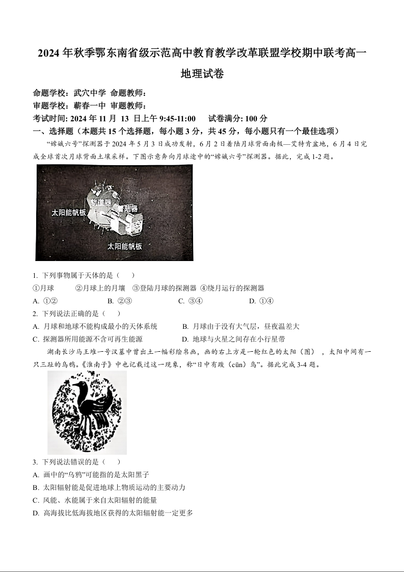 湖北省鄂东南省级示范高中教育教学改革联盟学校2024年秋季期中联考地理+答案
