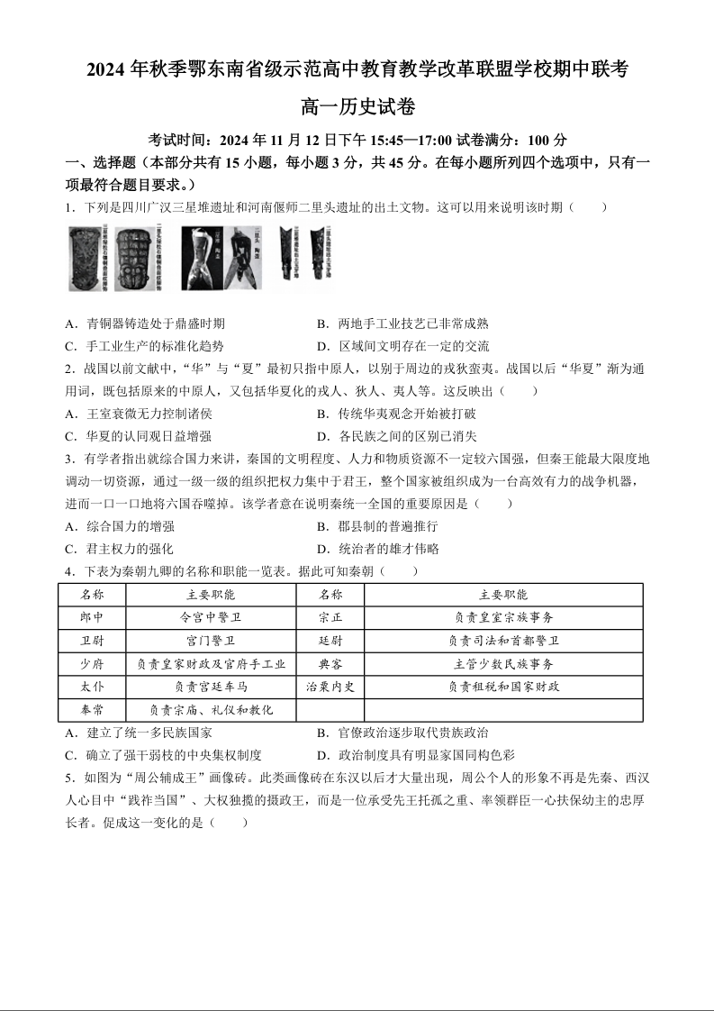 湖北省鄂东南省级示范高中教育教学改革联盟学校2024年秋季期中联考历史+答案
