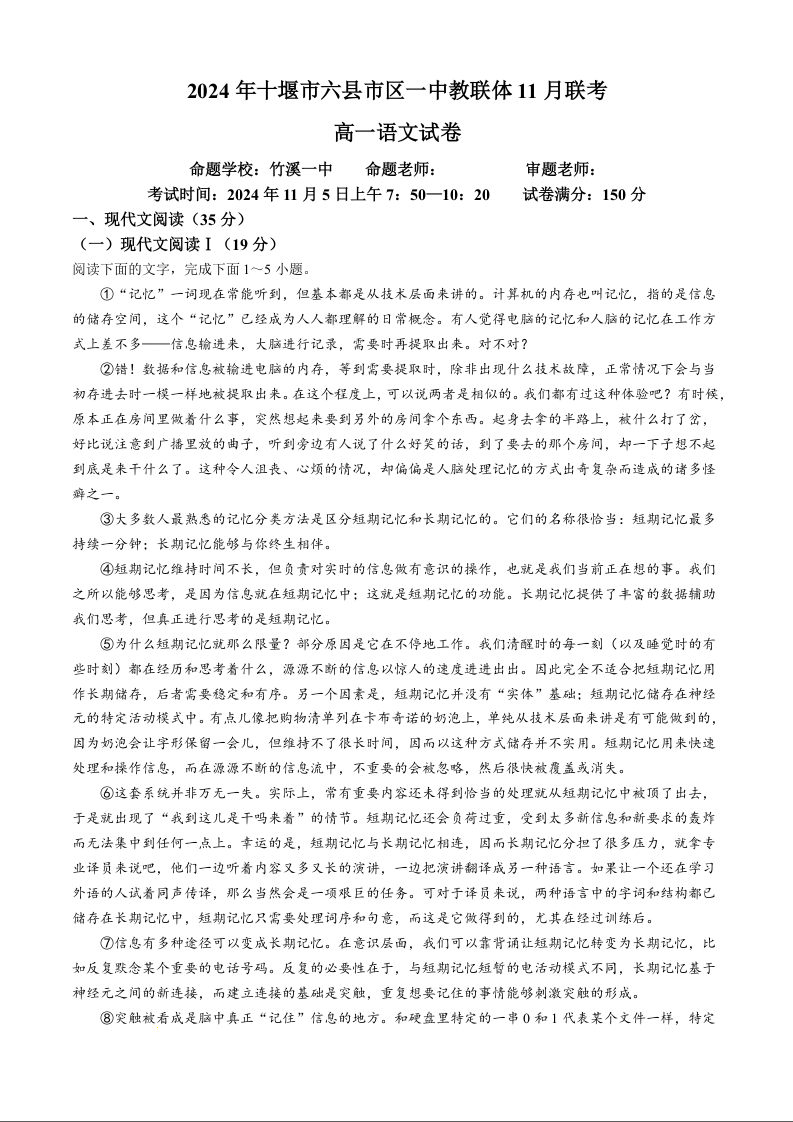 湖北省十堰市六县市区一中教联体2024年11月联考语文+答案