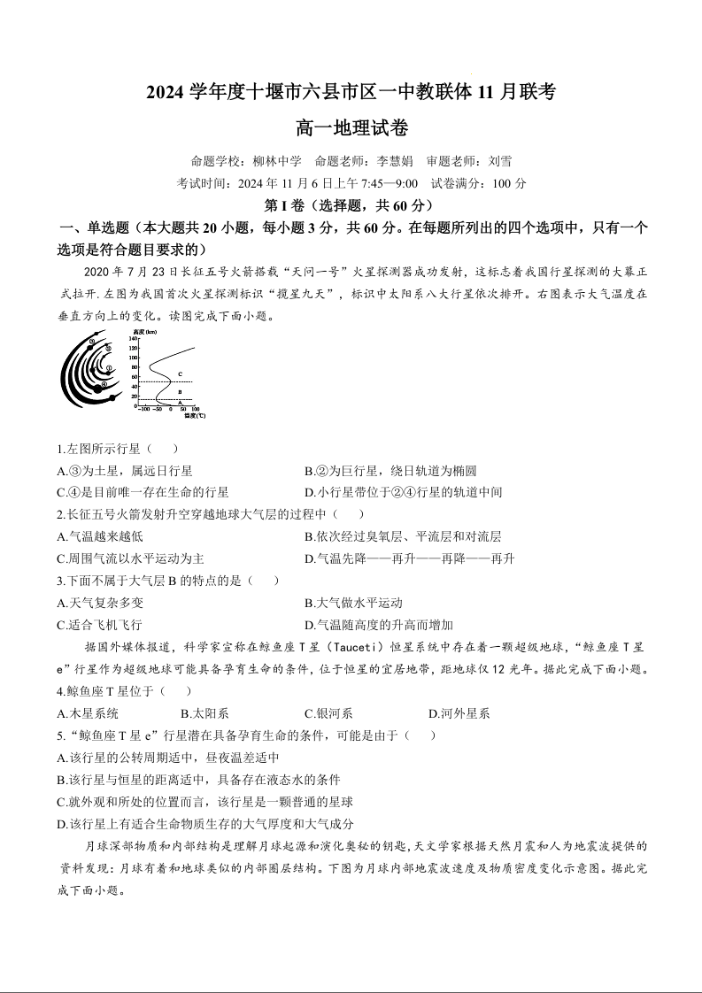 湖北省十堰市六县市区一中教联体2024年11月联考地理+答案