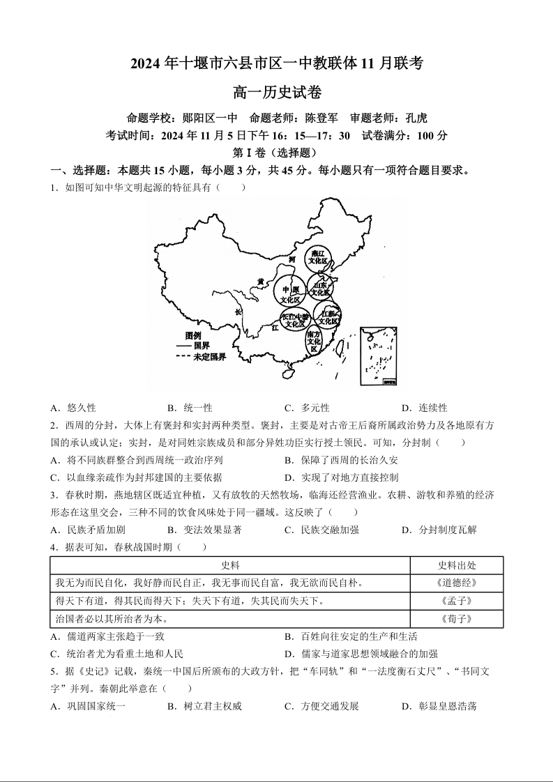 湖北省十堰市六县市区一中教联体2024年11月联考历史+答案