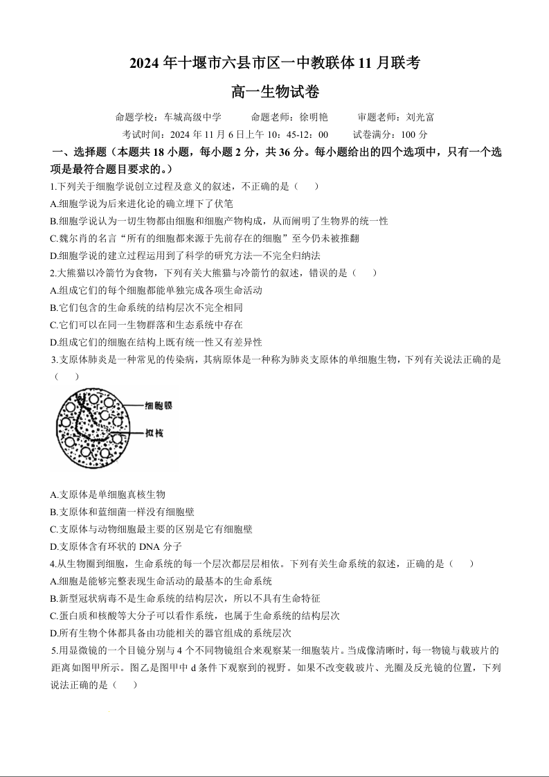 湖北省十堰市六县市区一中教联体2024年11月联考生物+答案
