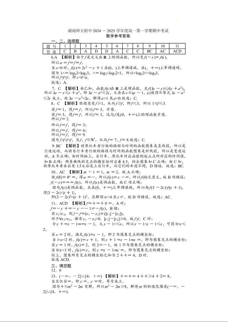 湖南省长沙市湖南师范大学附属中学2024-2025学年度高一第一学期期中考试数学答案