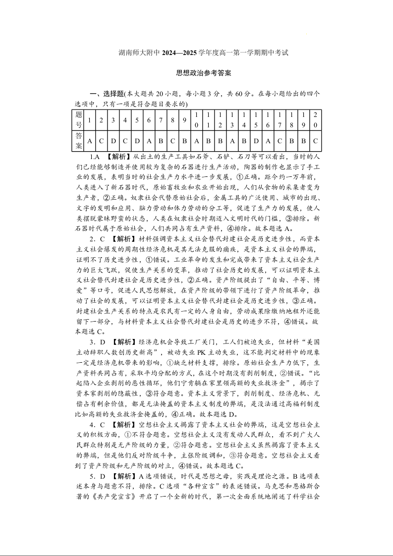 湖南省长沙市湖南师范大学附属中学2024-2025学年度高一第一学期期中考试政治答案
