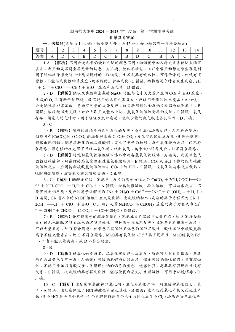 湖南省长沙市湖南师范大学附属中学2024-2025学年度高一第一学期期中考试化学答案