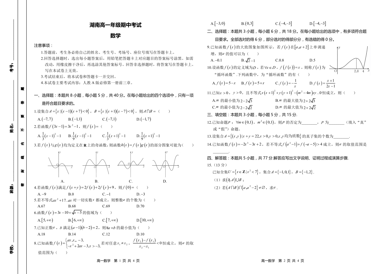 湖南省多校联考2024-2025学年高一年级期中考试数学