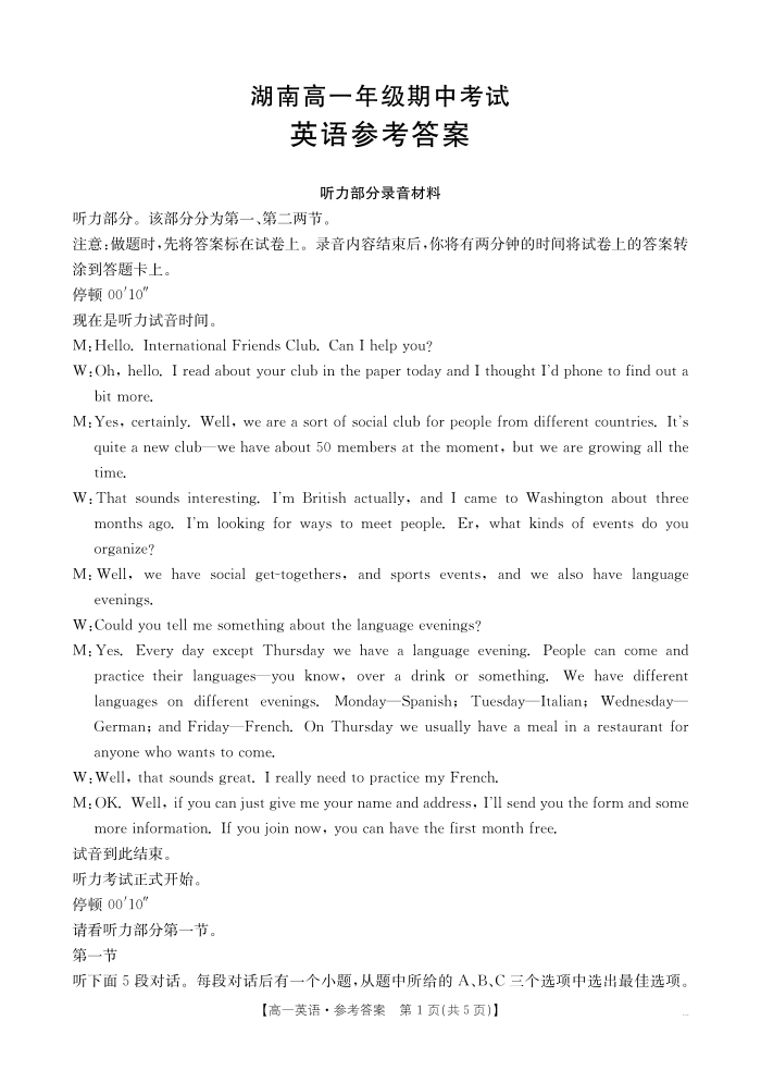 湖南省多校联考2024-2025学年高一年级期中考试英语答案
