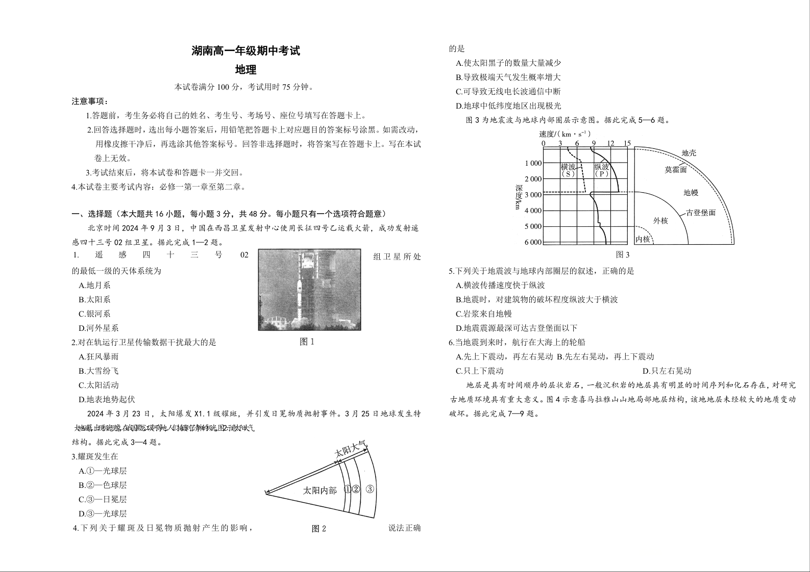 湖南省多校联考2024-2025学年高一年级期中考试地理