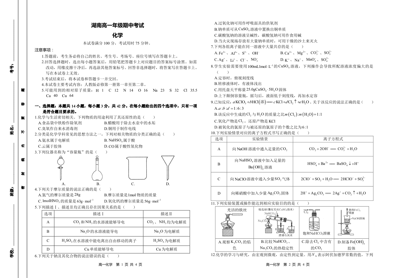 湖南省多校联考2024-2025学年高一年级期中考试化学