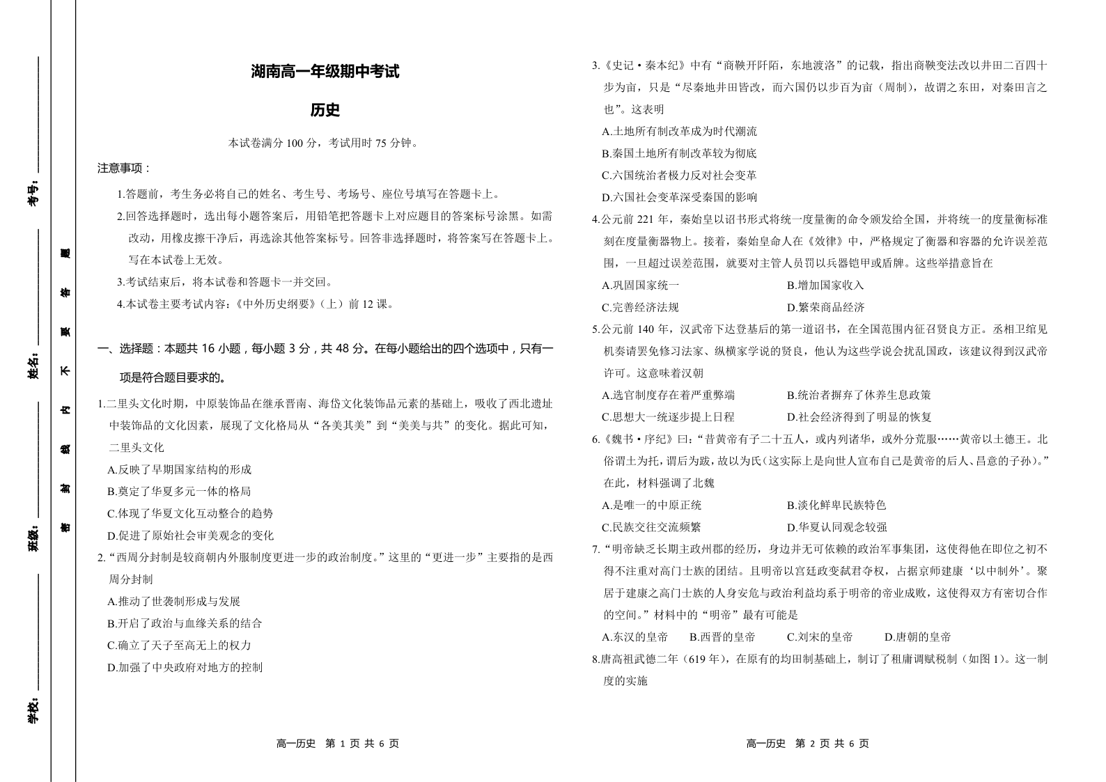 湖南省多校联考2024-2025学年高一年级期中考试历史