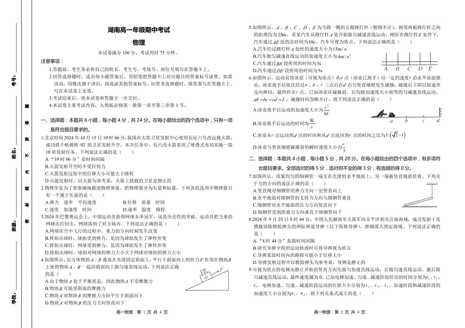 湖南省多校联考2024-2025学年高一年级期中考试物理