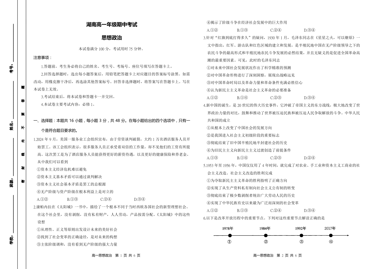 湖南省多校联考2024-2025学年高一年级期中考试政治