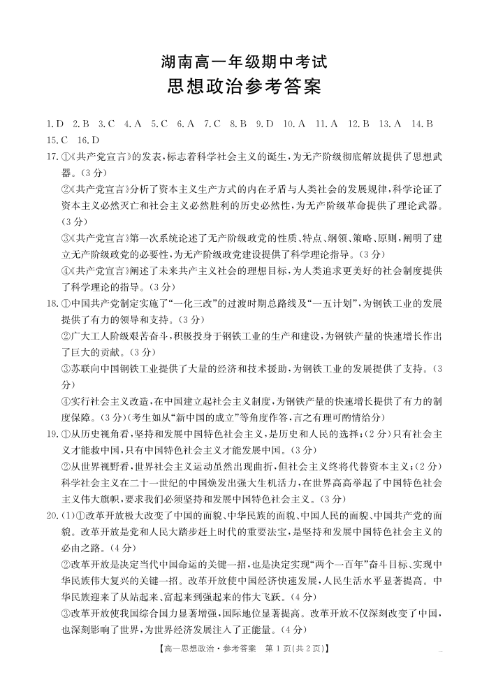 湖南省多校联考2024-2025学年高一年级期中考试政治答案