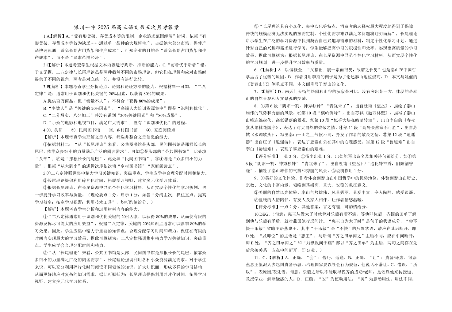宁夏回族自治区银川一中2025届高三上学期第五次月考语文答案