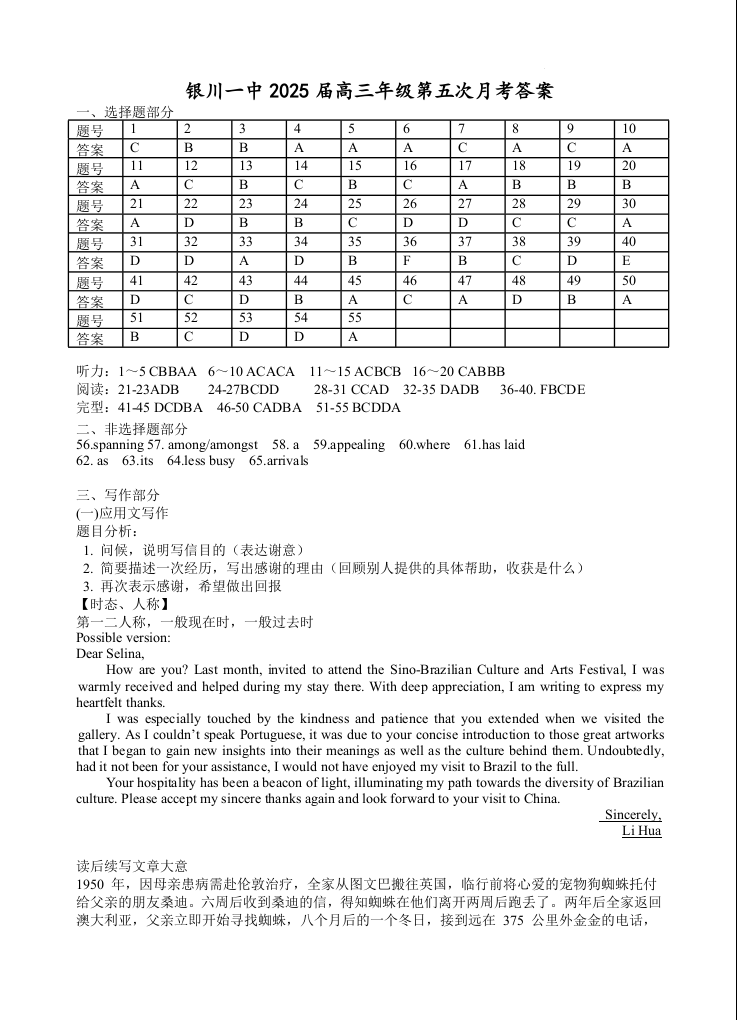 宁夏回族自治区银川一中2025届高三上学期第五次月考英语答案