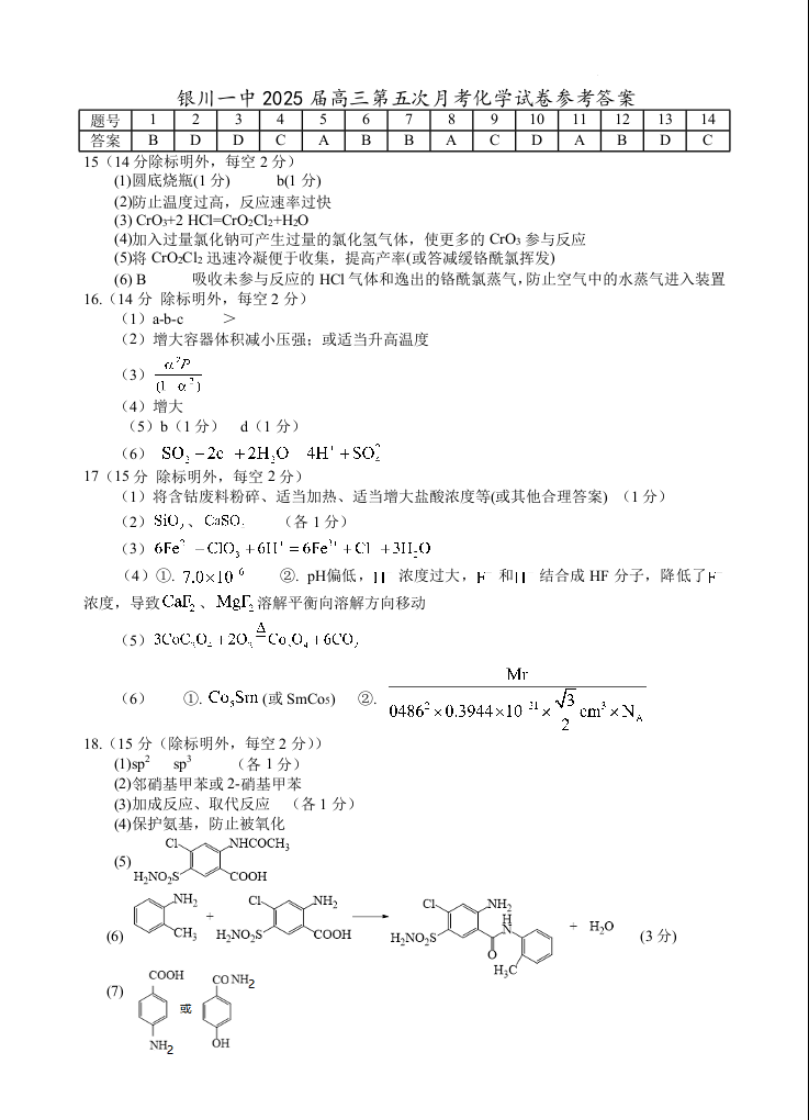 宁夏回族自治区银川一中2025届高三上学期第五次月考化学答案