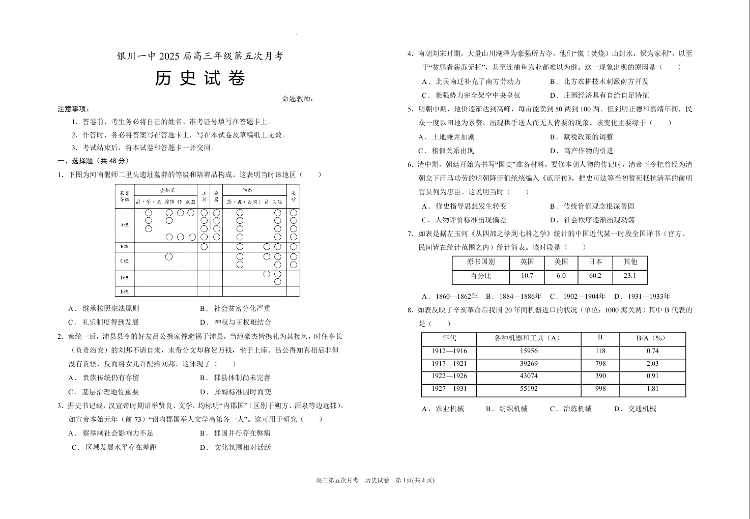 宁夏回族自治区银川一中2025届高三上学期第五次月考历史