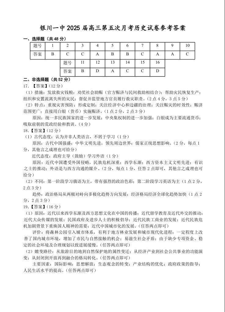 宁夏回族自治区银川一中2025届高三上学期第五次月考历史答案
