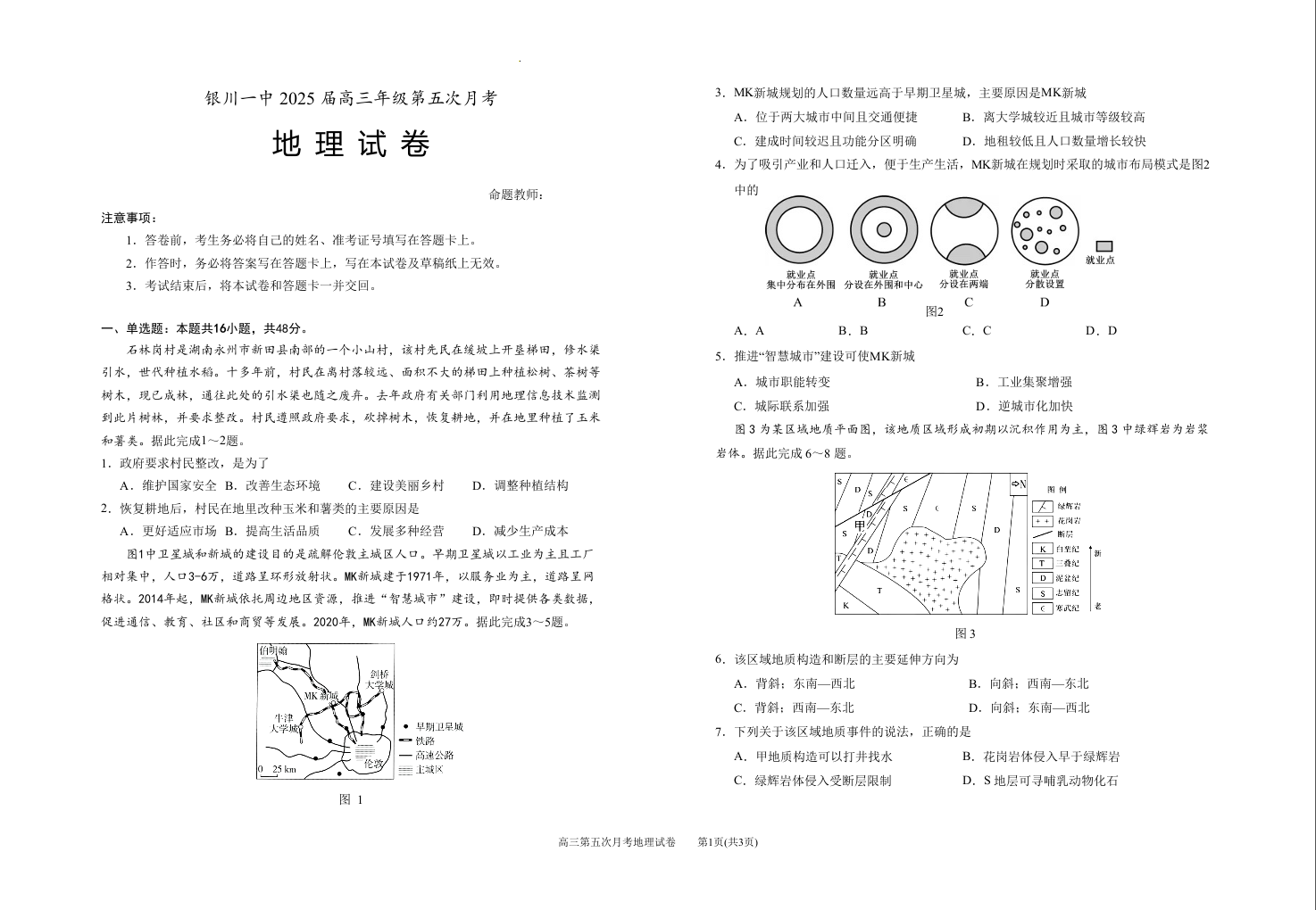 宁夏回族自治区银川一中2025届高三上学期第五次月考地理