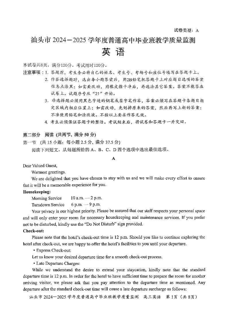 广东省汕头市2025届高三上学期12月期末教学质量监测英语