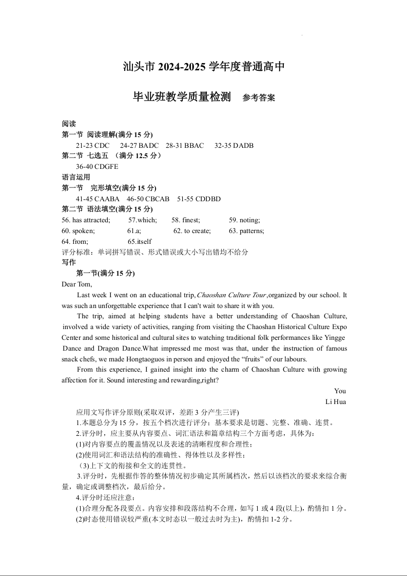 广东省汕头市2025届高三上学期12月期末教学质量监测英语答案