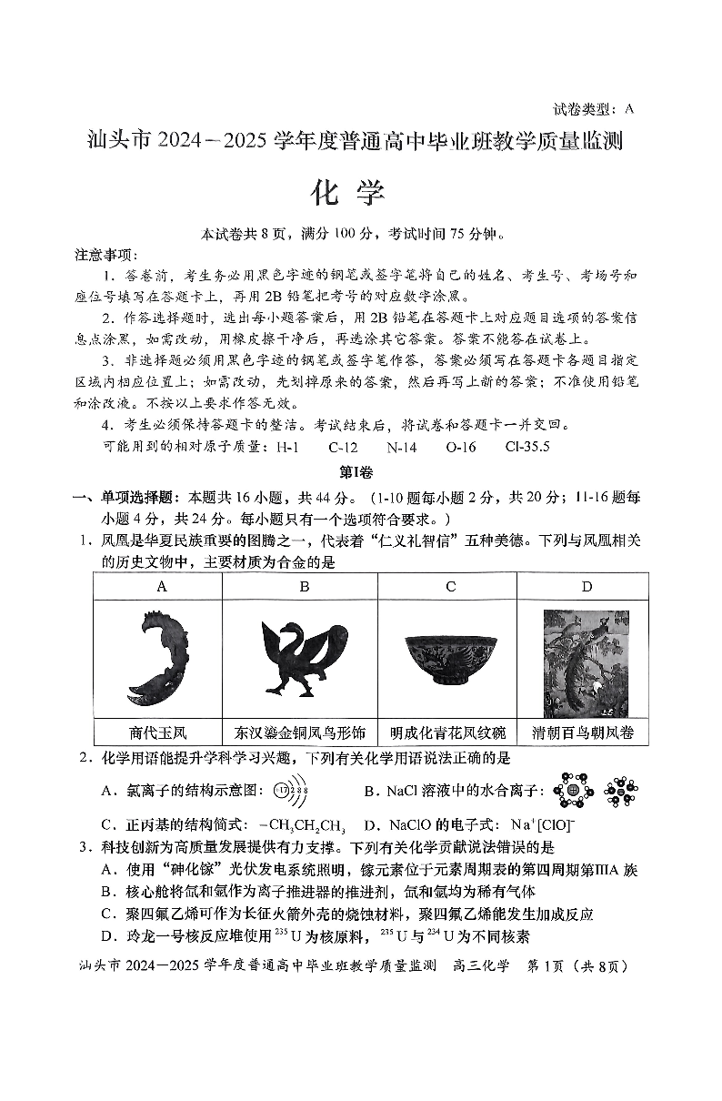 广东省汕头市2025届高三上学期12月期末教学质量监测化学